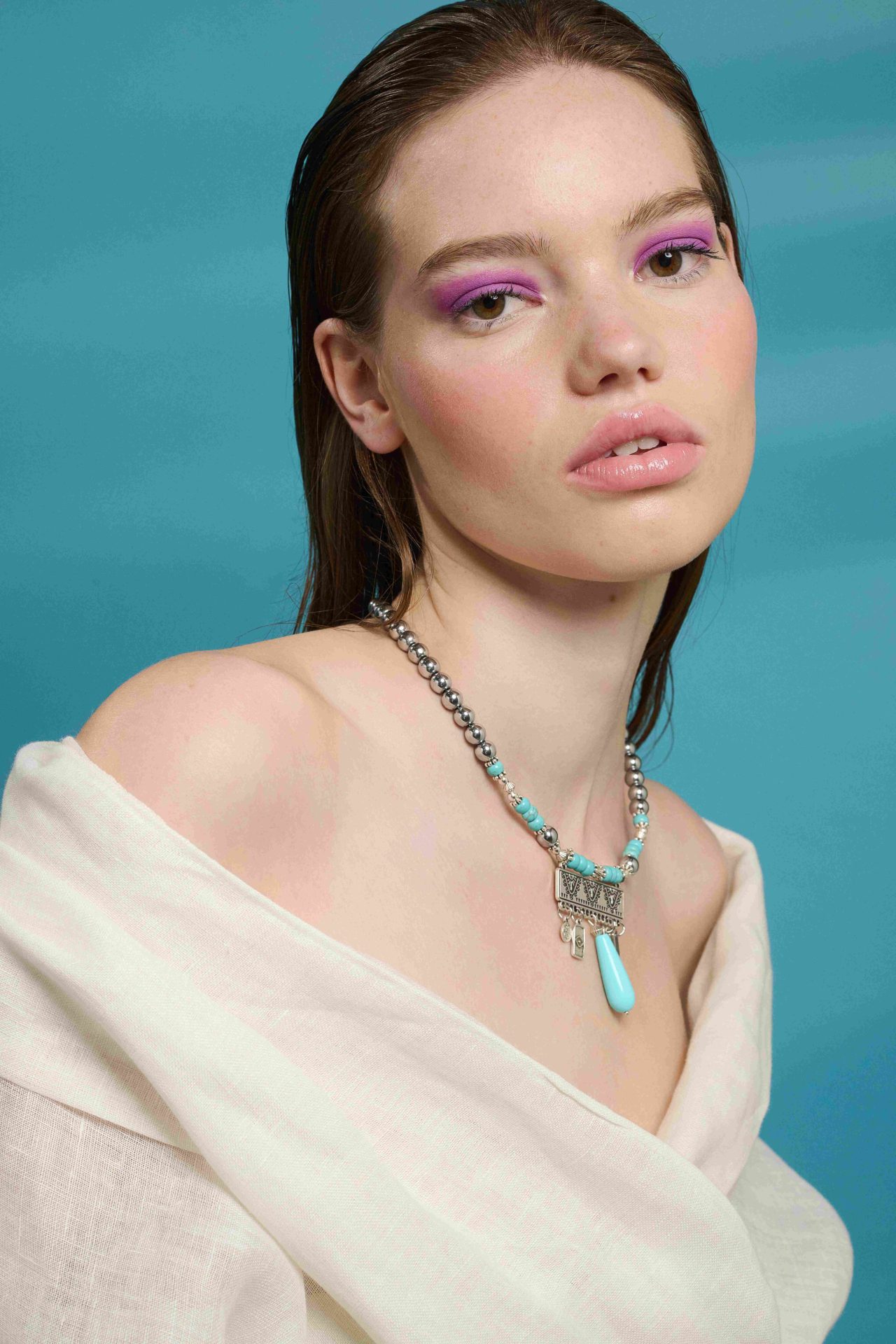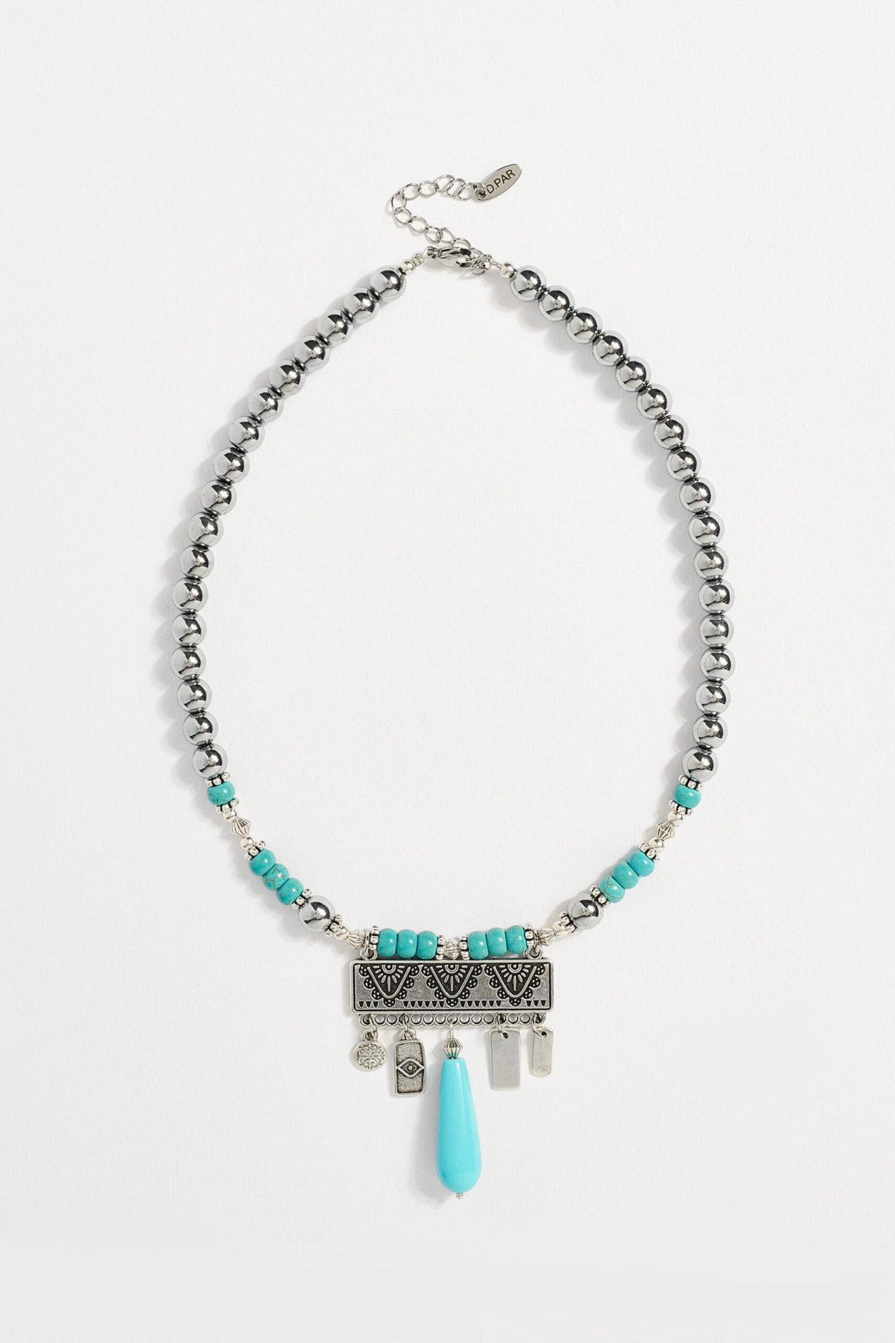 Κολιέ με χάντρα αιματίτη, τυρκουάζ χαολίτη και επάργυρα στοιχεία.