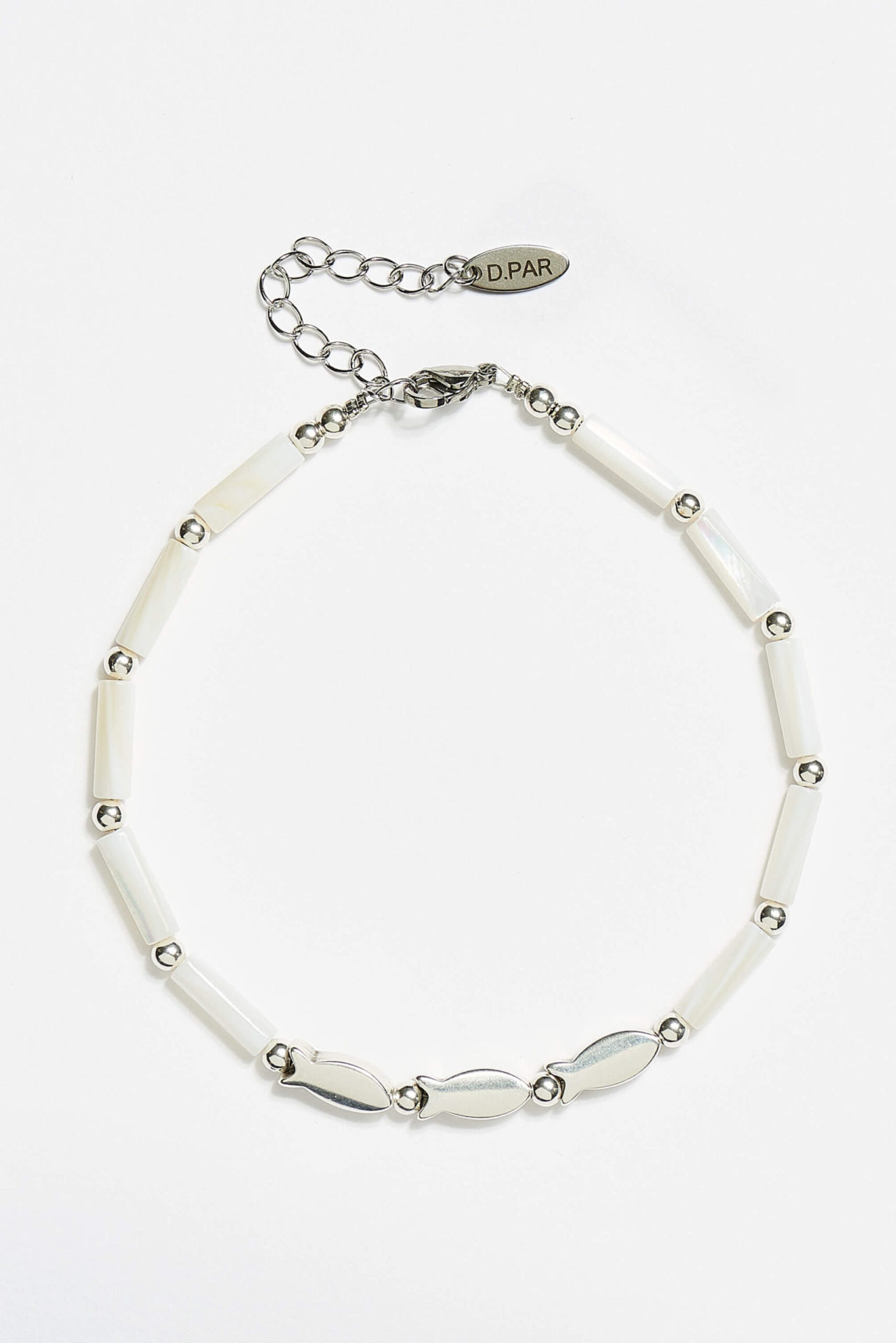 Βραχιόλι ποδιού λευκό φίλντισι με επάργυρα στοιχεία και ατσάλινο κούμπωμα